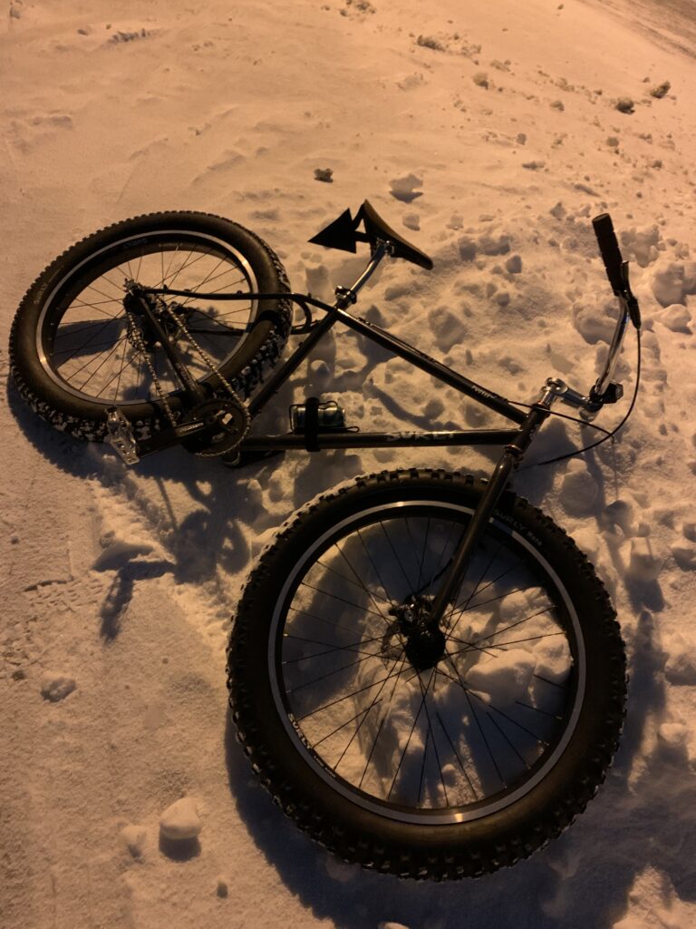 さて、昨日の朝ライドが楽しかったので、今日はPUGSLEYに乗ってその辺をうろうろしてきました。やっぱり雪道はファットも楽しい。リジットフォークのKRAMPUSだとちょっと緊張感のあるライドになるのね。路面の振動はダイレクトに伝わってくるし、BBが高くてタイヤが29erだから重心が高くなる影響もあるのかな?corner barで前傾にしてるってのも一因か。その点PUGSLEYの設計とパーツ構成は重心が低くて身体が起きる感じだから、ゆったり安心して走れる感じ。100m走と散歩くらい緊張感が違うんです。あー楽しかった。
