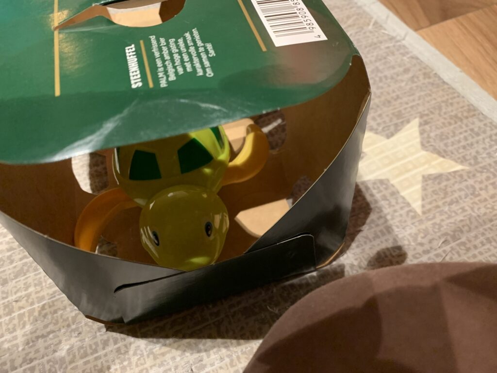 保育園から帰宅した妻と娘はリビングで一息つき、カメさんで遊んでいた。妻はそのまま夕飯の支度に取り掛かり、娘はそのまま一人遊びへ。おままごとにハマっている娘はカメさんのお家が欲しくなり、雑紙の中からビールのパッケージを発見。お家に見立てて遊んでいるうちにご飯が完成。そこに私が帰宅。