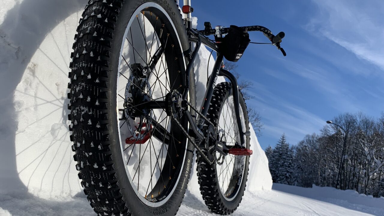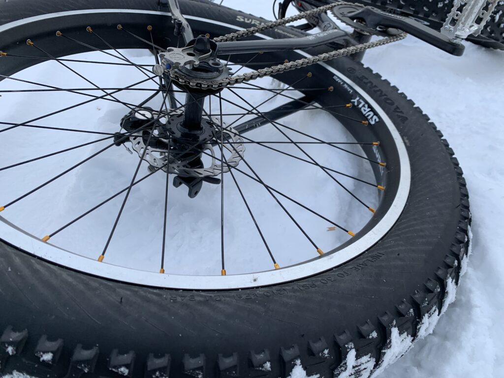 雪上自転車レースは、想像以上にタイヤで結果が変わります。脚力よりも、戦略よりも、まずはタイヤ。ジャージを着たガチ勢ひしめくレースで、シングルスピードの私が勝てたことがその証明でしょう。合言葉は「走破性」。できるだけ太くて、できるだけノブ高のタイヤを低圧で運用するのが吉です。多くの参加者がバイクを降りて押さざるを得ないシチュエーションでもなんとか走っていけたのは、タイム的にもメンタル的にも大きなアドバンテージでした。と言うことでファットタイヤは「有利」どころではなく最早「必須」。